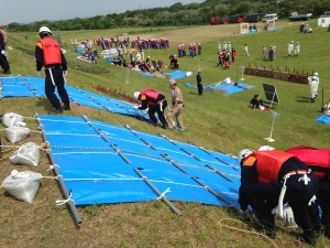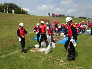 稲沢水防団は一宮水防団53人に次ぐ48人が参加、月の輪工とシート張り工を担当。