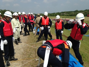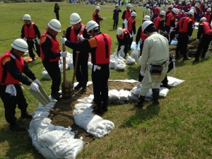 平成25年5月26日(日)、快晴の中、平成25年度の水防防災訓練が一宮市光明寺の木曽川河川敷で実施されました。稲沢市からは、第4中隊として石黒幸吉団長以下稲沢水防団48名(稲沢市消防団から選出)が参加、月の輪工、シート張り工を分担し、訓練の成果を披露しました。鈴木も大野市長、出口副議長さんたちと早朝8時前の激励から参加し、地域住民も含め総勢570人の訓練を巡視しました。