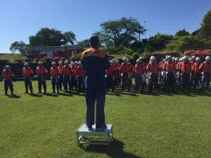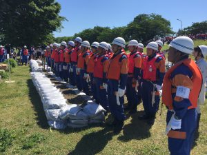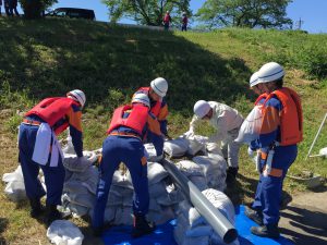 平成29年5月28日 愛知県尾張水害予防組合の水防防災訓練が台風などの出水期を前に犬山市木津地先木曽川犬山緑地で実施されました。稲沢市からは一宮市より多い小沢団長以下水防団(消防団)59名が参加し、月の輪工、積土のう工の訓練を行いました。団員の皆さんには13日の操法大会に続き休日早朝からの出動でお疲れ様でした。