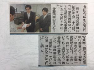 平成29年7月29日 中日新聞朝刊の県内版に豊田合成労組(鈴木委員長 組合事務所は稲沢市❗️)さんが九州豪雨義援金の記事が掲載され後藤さんと源治さんの写真つきで掲載されていました。頻発する局所的集中豪雨への抜本的な新たな対策が必要です。