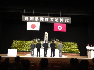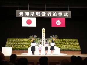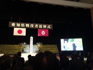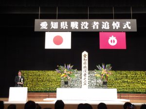 平成29年8月15日 今年も終戦の日を迎え愛知県戦没者追悼式が厳粛な中、挙行されました。愛知県では12万6千人の方が戦火に倒れられました。軍人の方89,500人、軍属の方4,600人、学徒動員などの準軍属の方5,700人、一般の方は1万8,200人と推計されています。遺族代表服部さんの96歳とは思えない力強い『戦没者遺族の歩んできた道のりは苦難の連続だった。我が国の平和と自由を守り世界の恒久平和のために力を尽くし遺志に応える』という言葉に胸を撃たれました。
