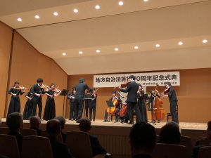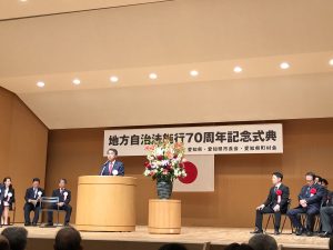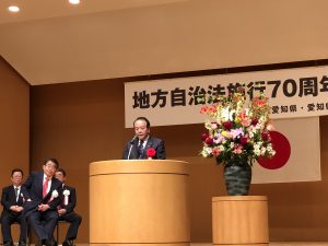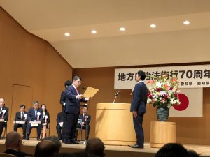 平成29年12月19日 地方自治法施行70周年記念式典が、大村愛知県知事、佐原市長会長、大須賀町村会長主催で開催されました。愛知芸術大学学生によるオープニングの演奏に続き、式典では長年に亘り地方自治の健全な発展にご尽力頂いた方々が表彰されました。