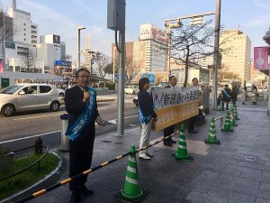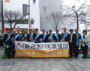 平成30年3月26日 2月定例会の閉会日、定例となった県政報告の街頭活動を新政あいちとなって初めて実施しました。最初は鈴木が総務会長として平成22年の6月定例議会閉会日に自作のたすきで名古屋駅のロータリーに当時の民主党県連の街宣車をお借りして行いました。今回の横断幕も鈴木じゅん印刷所?です。