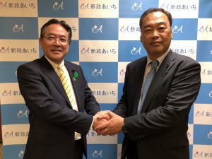平成30年5月8日 稲沢市老人クラブ連合会(ねんりん)の総会の後、明日の新政あいちと連合愛知の政策協定の調印式の準備で県議会に、出来立ての新政あいちのバックボードの前で中村晋幹事長との一枚です。天野議員はじめ多くの皆さんの汗のおかげで前に進んでいます。