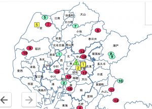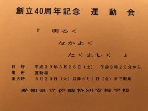 平成30年5月26日 愛知県立佐織特別支援学校創立40周年記念運動会が晴天のなか開催されました。稲沢特別支援学校の運動会も同日でしたが、40周年記念ということで久し振りに佐織にお邪魔して子ども達の元気な姿を見学させて頂きました。図の❾はいなざわ特別支援学校、➓佐織、❷一宮東、黄四角の5一宮聾学校、緑の⑤一宮(肢体不自由)特別支援学校、子ども達は遠くから先生方や保護者の皆さん地域の皆さんのお力も頂き頑張って通学しています。