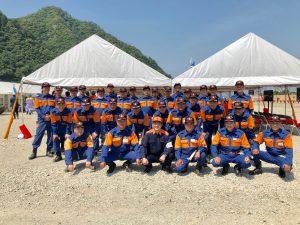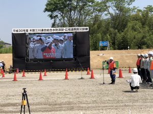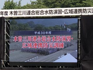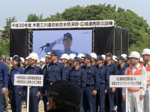 平成30年5月27日 木曽三川連合総合水防演習・広域連携防災訓練が岐阜市内の長良川右岸で総裁である石井国土交通大臣も参加され実施されました。2年に一度、愛知県、岐阜県、三重県の持ち回りで実施される訓練で国土交通省中部地方整備局、3県、地元市などが主催です。愛知県からは代表して稲沢市消防団(稲沢水防団)30名が演習に参加し月輪工を実施しました。