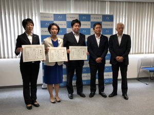 平成30年9月8日 新政あいち並びに新政あいちを通して連合愛知の推薦(第1次分)の決定を受け新政あいち役員会で連合愛知の佐々木会長にお越し頂き塚本代表と、県議会を代表して河合議員、名古屋市会を代表して日比議員、一般市町村会を代表して小山議員に推薦状をお渡し頂きました。
