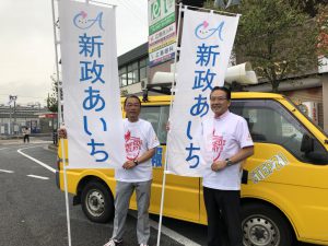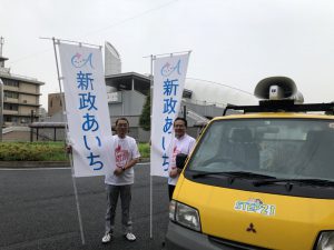 平成30年9月20日 昨日の国府宮駅に続いて今日はJR稲沢駅前ロータリーで木全市議はじめボランティアの皆さんと毎月の県政・市政報告の街頭活動を行いました。今月の22日から24日に開催されるスペシャルオリンピックス(有森裕子大会会長)のPRも兼ねてユニファイドリレーの時に着用したTシャツを着ての街宣です。新政あいちの登りは7月から使用しています。