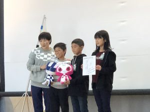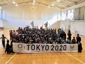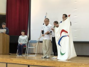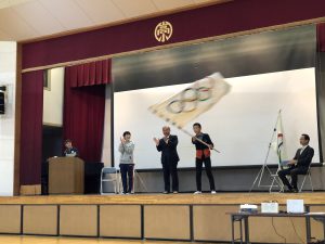 平成30年11月26日 東京2020オリンピック・パラリンピックフラッグツアーの学校訪問が稲沢市立高御堂小学校で行われました。フラッグツアーは県内37所で行われましたが学校訪問は道府県で各1校です。高御堂小の大島校長先生は稲沢北小でお世話になった方で楽しく子ども達と参加しました。アンバサダーのオリンピアンは常滑市出身の村上睦子さん(アトランタ1996大会バスケットボール出場 現:岩屋)が務められました。