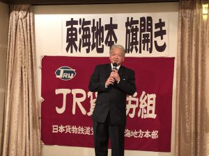 平成31年1月12日 日本貨物鉄道労働組合東海地方本部の旗開きが関係の皆さまお集まりのなか盛大に開催されました。県議会からは鈴木と一宮選出の高橋県議のほか稲沢からは星野元市議もお招き頂きました。細川執行委員長からは西日本豪雨等災害による公共交通の断絶などのほか本年は明るい未来を創造する新しい時代の幕開けにと年頭のご挨拶がありました。