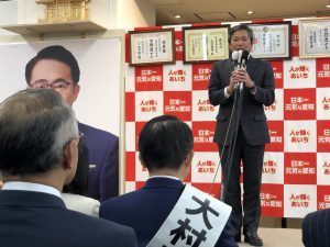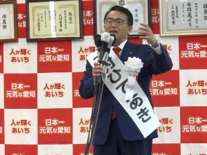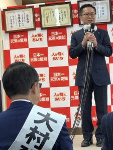 平成31年1月17日 愛知県知事選挙が告示され新政あいち並びに新政あいち県議団が推薦する現職の大村秀章知事・候補の出発式が行われました。これまでの実績をもとに全ての人が輝くあいちを目指して3期目の当選へ全力投球です。稲沢での個人演説会は19日午後6時半から勤労福祉会館で行います。皆様にご来場頂き大村候補の県政にかける熱意をお聞き取り頂きますようお願いします。