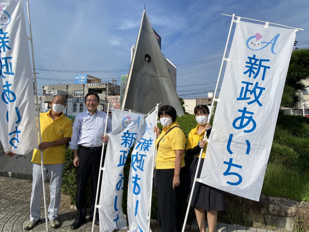 令和2年9月23日 台風の影響も懸念され天候が心配でしたがSTEP21の9月街宣を国府宮駅のロータリーをお借りして行いました。9月定例愛知県議会に上程された一般会計補正予算などについて広報させて頂きました。(木全市議は委員会のため途中離脱で写真には入っていません)