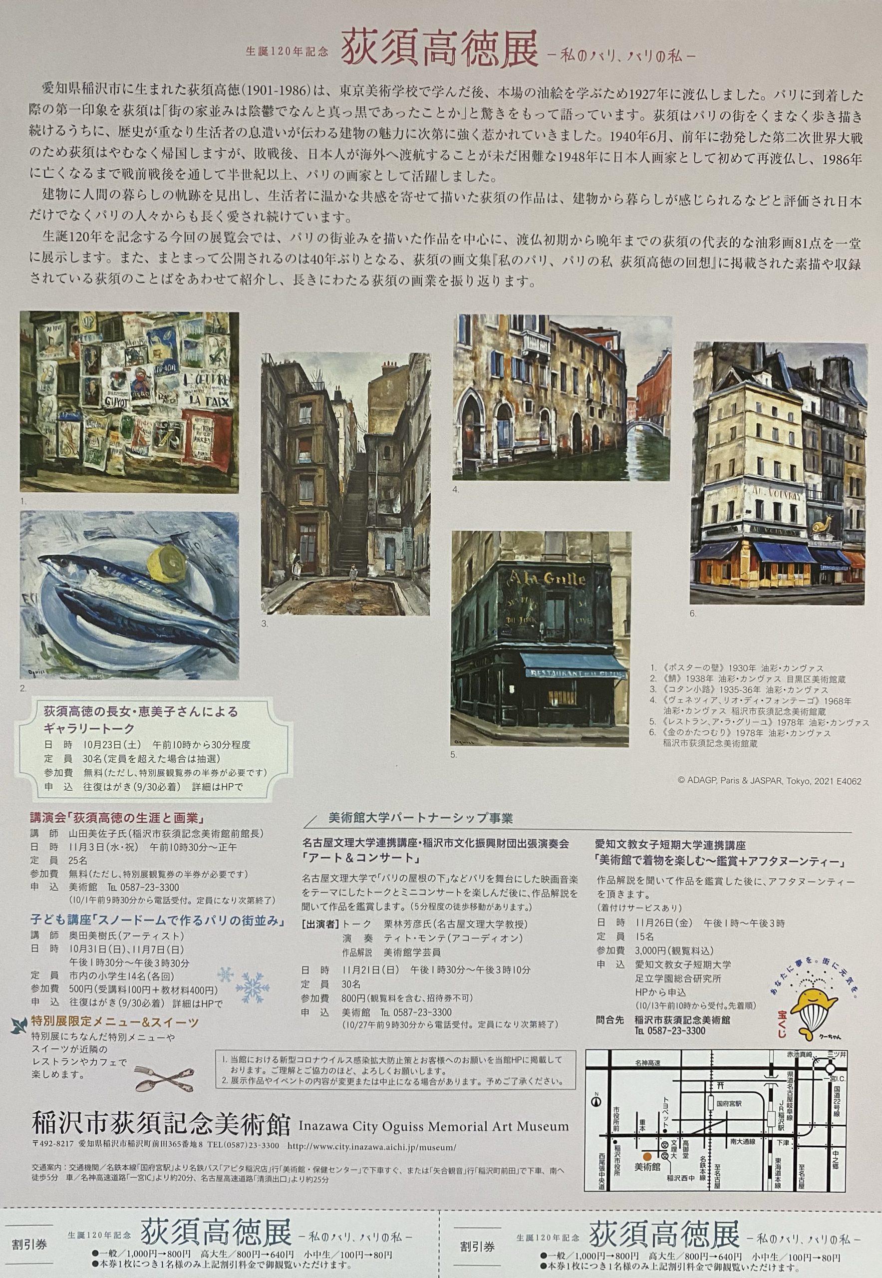 令和3年10月22日 「生誕120年記念 荻須高徳展〜私のパリ、パリの私〜」の内覧会が感染拡大防止のため規模を縮小して開催されました。パリの街並みを描いた作品を中心に特別+常設展示室に81点に上る作品が展示され、長きにわたる荻須画伯のパリの街並みとそこで暮らす人々への想いが伝わる素晴らしい特別展です。会期は12月19日まで、近隣のレストランなどでは特別限定メニューのコラボもあります。