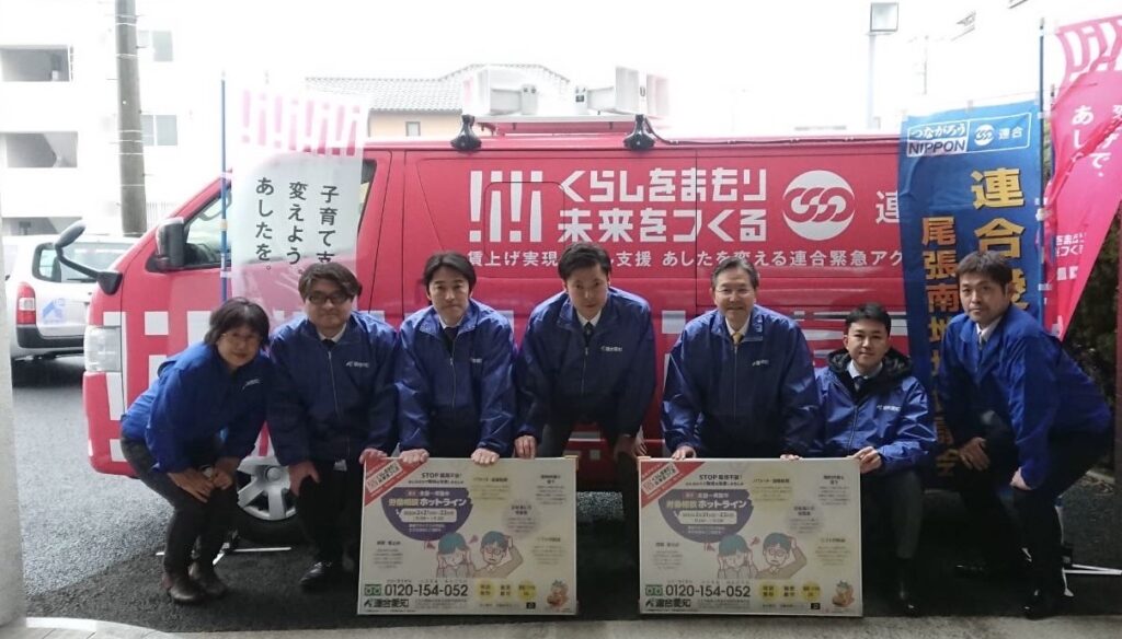 令和5年2月10日 全国を回っている連合のキャラバンカー『くらしをまもり未来をつくる』賃上げで、変えよう。未来を。が連合愛知尾張南地協にやって来ました。また連合愛知尾張南地協後藤代表から今春の統一地方選挙に向けて推薦状を頂きました。