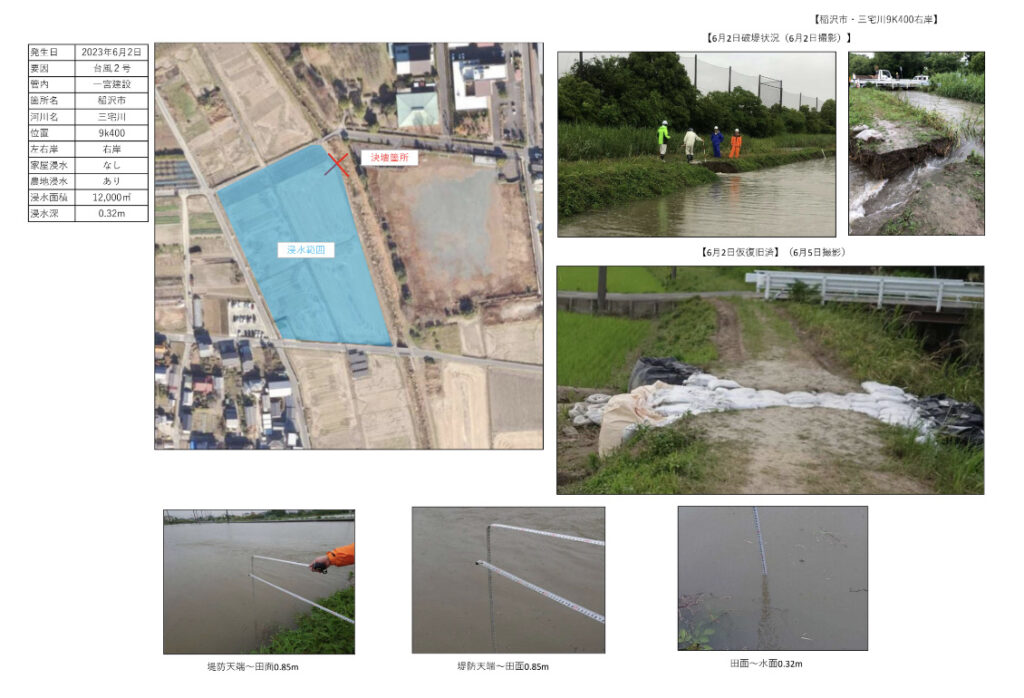 令和5年6月7日 6月2日の台風2号と梅雨前線による記録的な大雨は特に東三河方面に大きな爪痕を残しましたが稲沢市でも三宅川の池部側が破堤し田圃に泥水が流れ込みました。県の一宮建設事務所が稲沢市と連携し仮復旧しました。