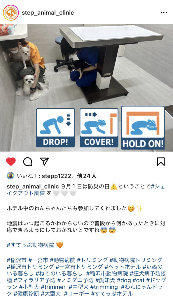 令和5年9月1日 すてっぷ動物病院(娘が副院長さん)もシェイクアウト訓練に参加してくれました。