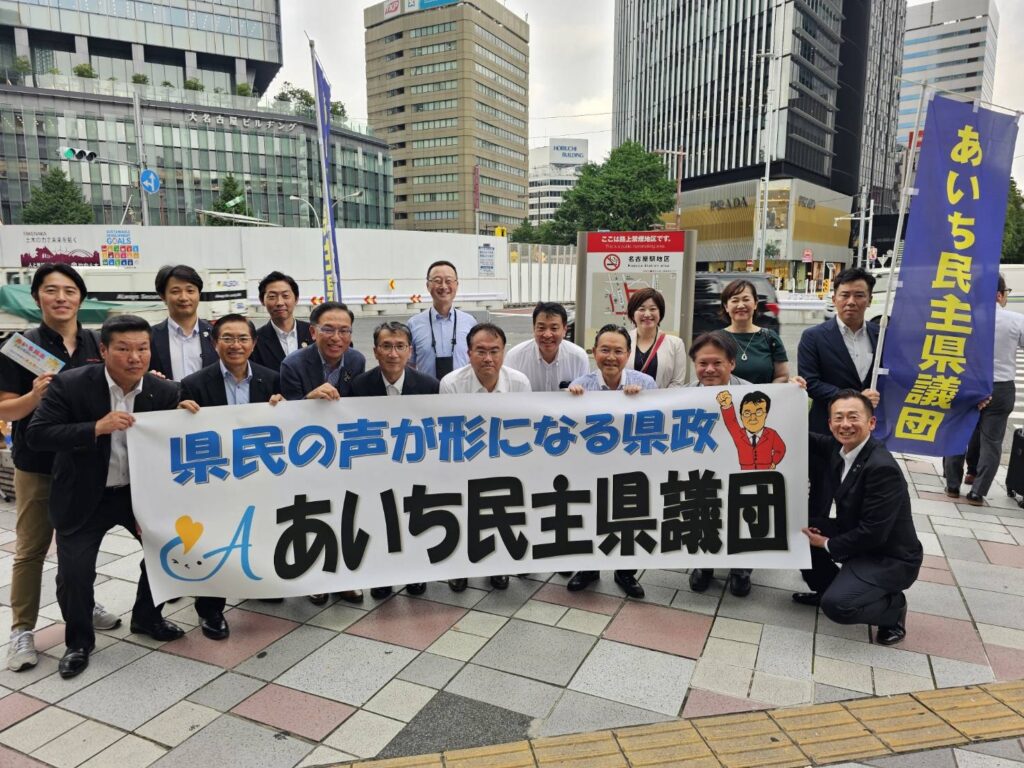 令和6年7月3日 6月定例県議会閉会日に14年続けている県議会の県政報告を森井団長のもと名古屋駅東口で実施しました。今年度のスローガン「県民の声を形に」の横断幕は鈴木製作です!