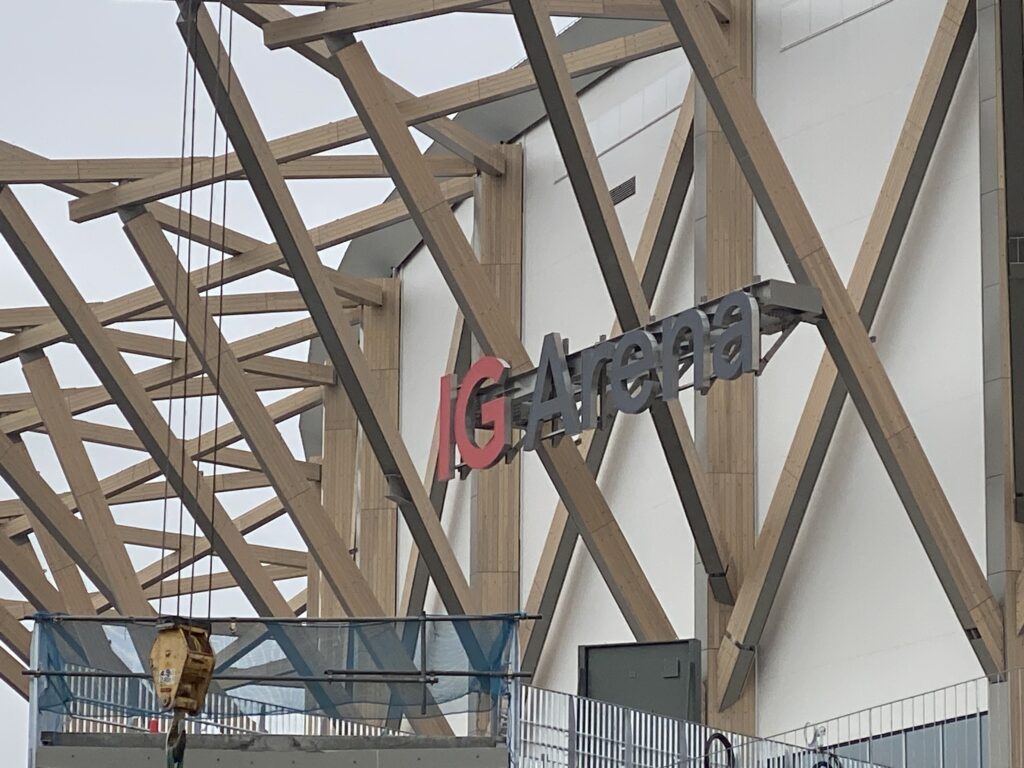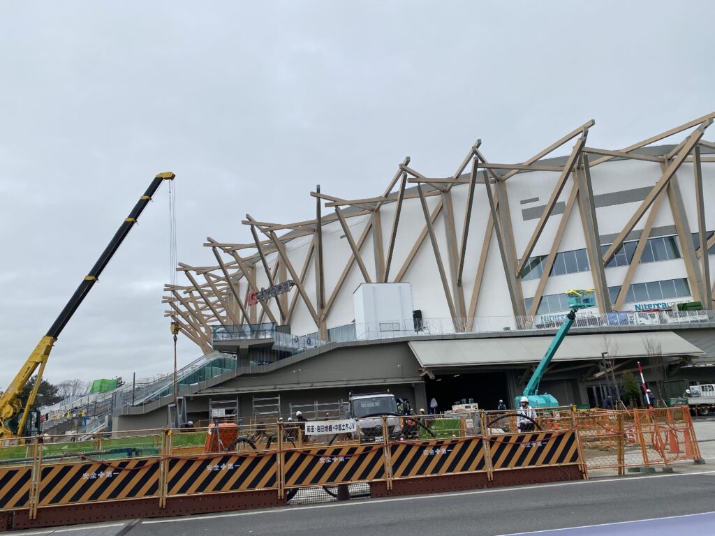 令和7年3月12日 名城公園交差点から見た今年度末に建物の竣工を迎える愛知県国際アリーナIGアリーナです。