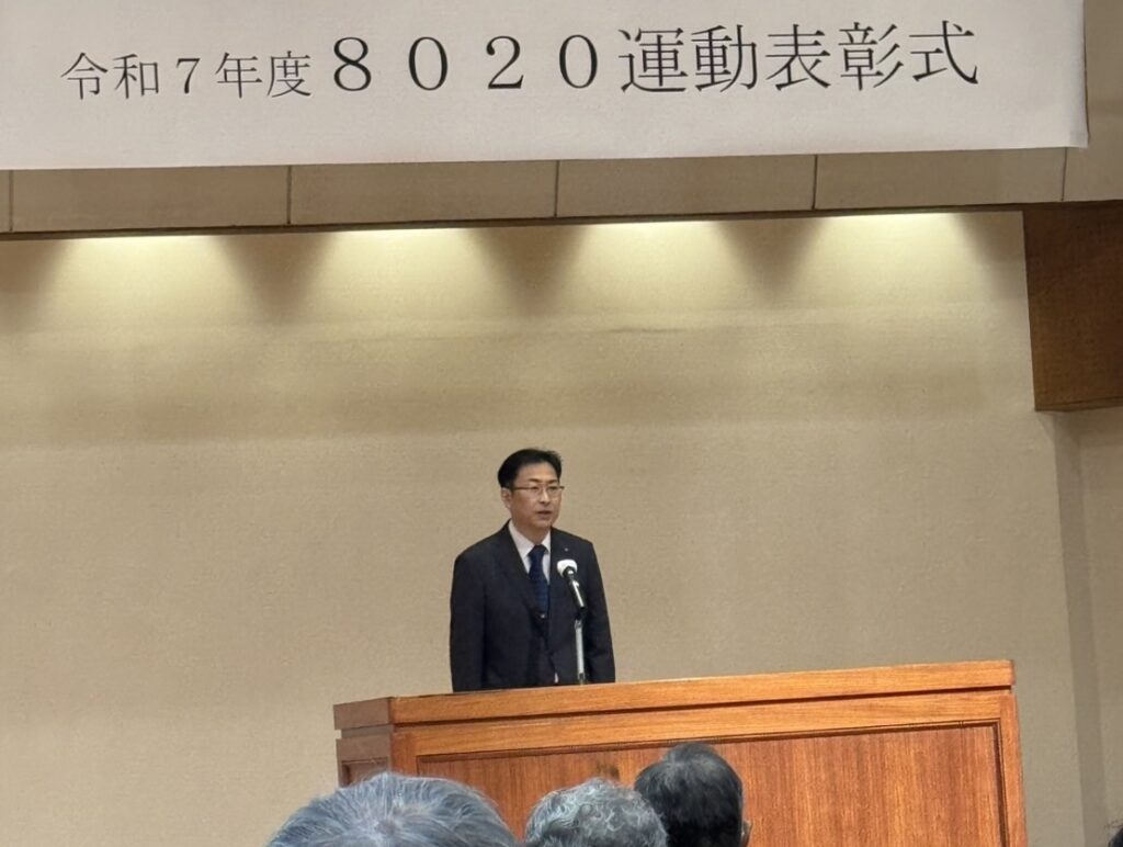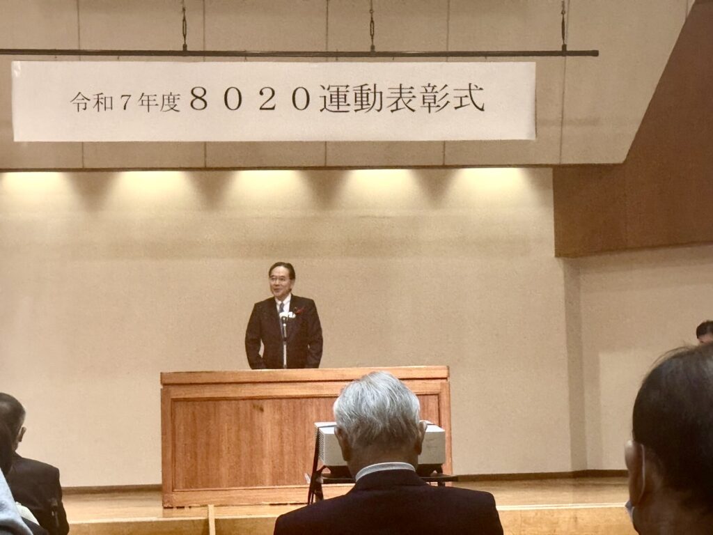 令和7年10月30日 稲沢市歯科医師会主催、稲沢市共催による令和7年度稲沢市・稲沢歯科医師会8020表彰式が開催され、対象の160名を代表し菅沼重夫様が表彰状を授与されました。8020運動は愛知県から始まった運動で80歳で20本以上の歯を保とうというもので、鈴木も皆様のオーラルケアの取組に敬意を表し、これからも心豊かに健やかな日々をお過し頂くようご祈念申し上げるとともに、竹市会長はじめ稲沢市歯科医師会の先生方の地域の健康づくりへのご尽力に敬意と感謝を表しお祝いの言葉を述べさせて頂きました。