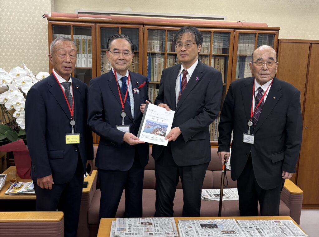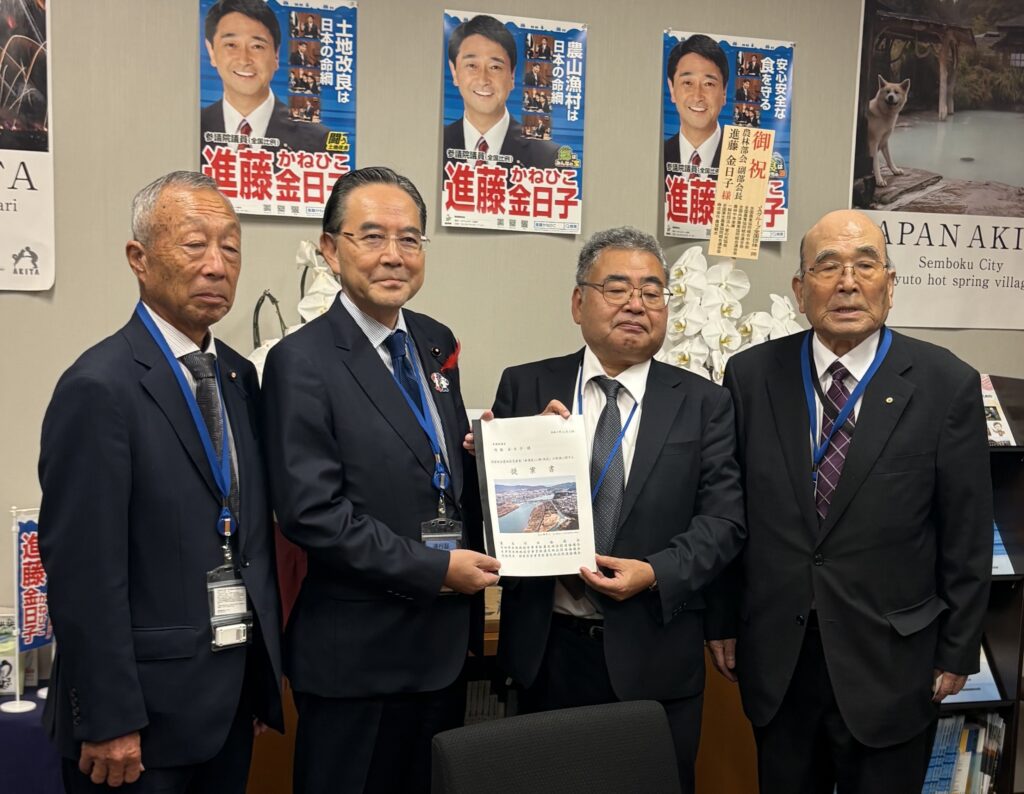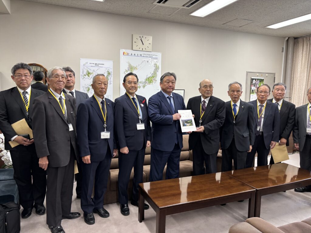 令和7年11月13日 鈴木が会長を務める濃尾用水協議会、宮田、木津、羽島の各国営事業新濃尾地区促進協議会の農林水産省へ、国営総合農地防災事業「新濃尾(二期)地区」の促進に関する提案活動を、各土地改良区理事長はじめ事務局、関係市の皆さんや随行に竹内海部農林水産事務所長と総勢16名程で行い、関係国会議員の皆さんにも挨拶しました。翌日は木津用水の穂積理事長が会長を務める国営農業水利事業促進東海協議会として同様に提案活動を行いました。