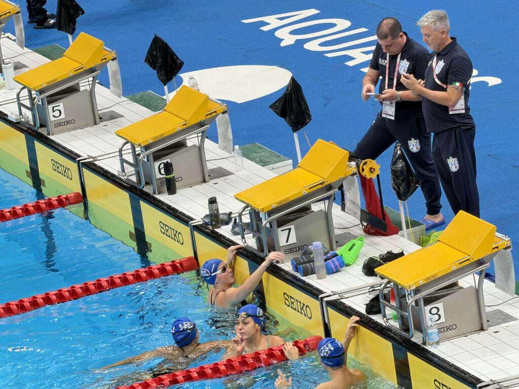 水泳競技開会日の調査でちょうど吉田選手がバタフライ100mに出場したところを観戦できました。決勝進出は出来ませんでしたが50mに期待です。向こう側の小学生席ではテーマカラーの桜色のパネルに自由に描き込み応援してます。