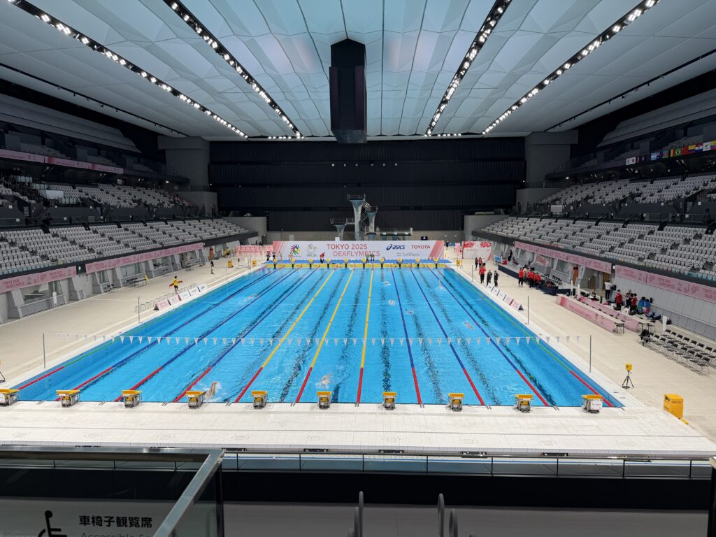 東京 2020 オリンピック会場になった江東区のアクアティクスセンターでは選手や VIP の動線、スタートの聴覚障碍者に対する配慮、施設整備など実際の競技会場の運営方法等について聴取しました。