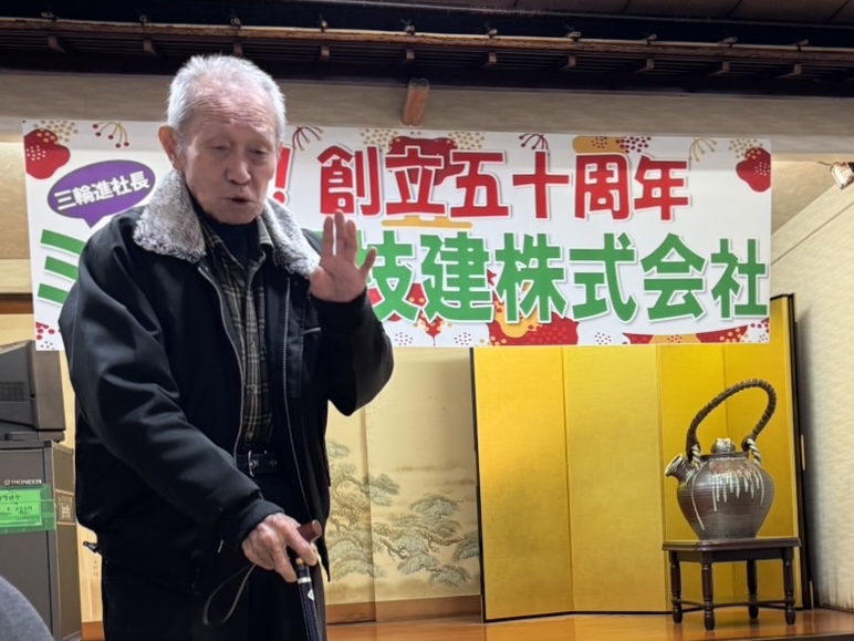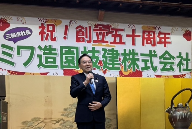 令和7年12月26日 ミワ造園技建株式会社の創立50周年忘年会が開催され、帯状疱疹後神経痛で禁酒中でしたがお世話になっている三輪進社長にお会いしたく鈴木純後援会の島田吉幸事務局長と妻共に出席させて頂きました。社長は義母を『君子姉さん』と言って義父幹雄(稲沢市議会議員)を支え後継の私も支えて頂き、会社は稲沢建設とも取引があり、造園業界でも会長を務めるなど半世紀の長きに亘り活躍されています。