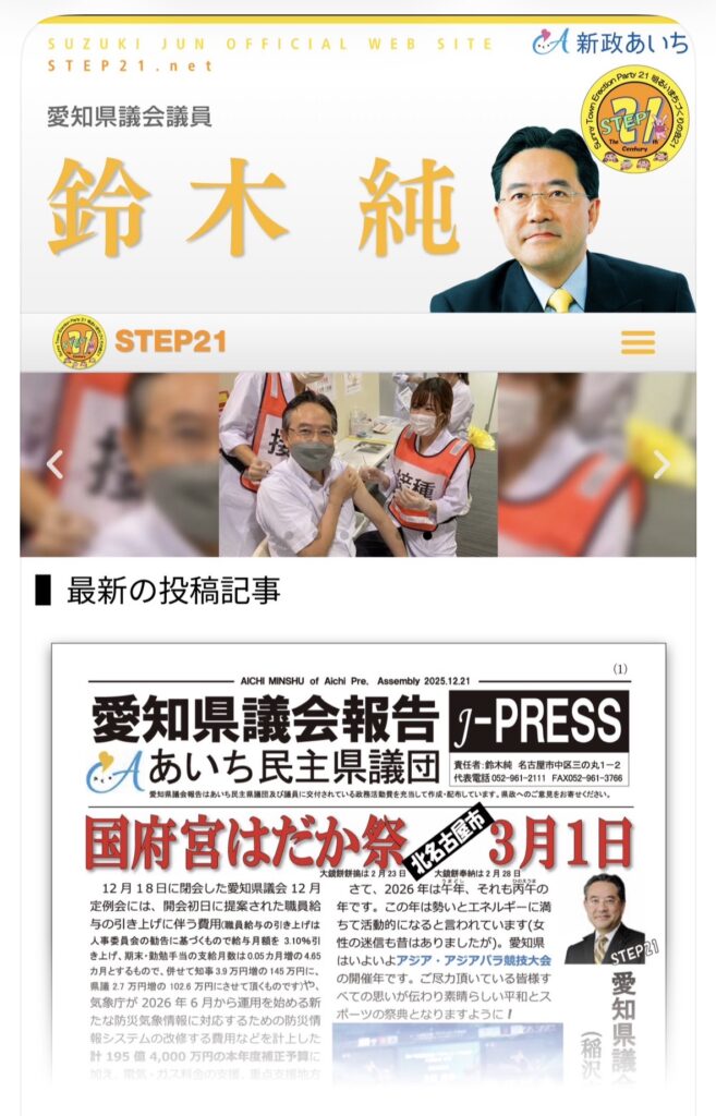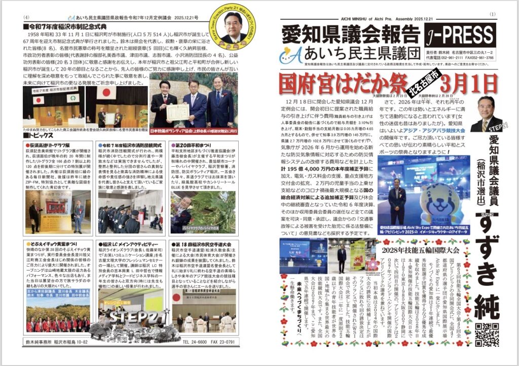 令和7年12月29日 愛知県議会の12月定例会の議会報告のデータが届きましたので鈴木純公式ホームページにアップしました。挨拶回り用に早めに作りましたので、国の大型補正分(1、288億円)は入っていません(STEP21街宣資料をご覧下さい)。また、記載の意見書は内容を深めるため今回は提出を見送ったことをご了承下さい。