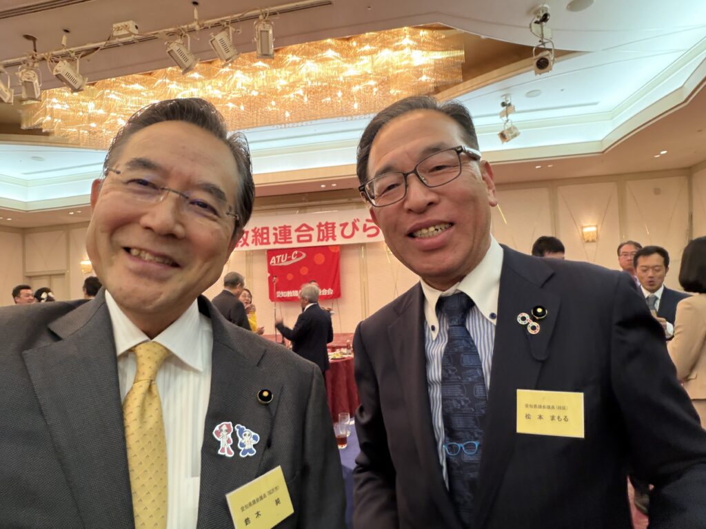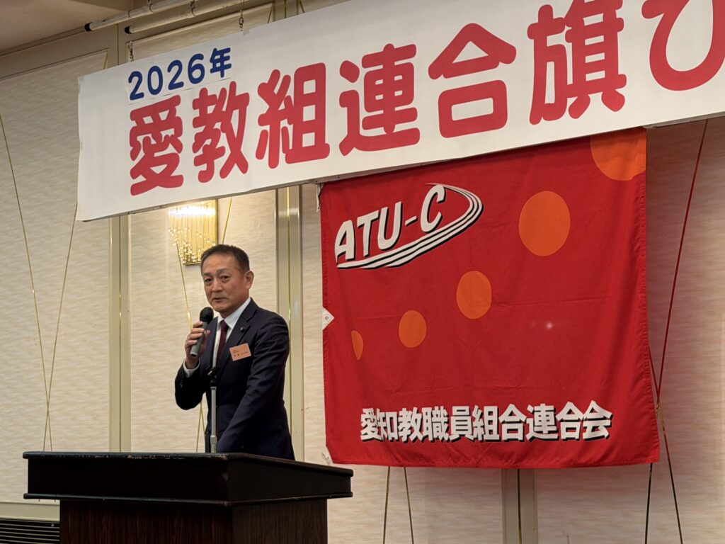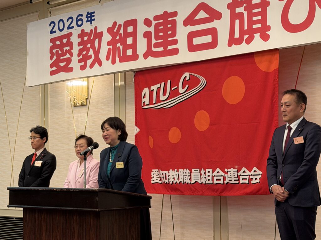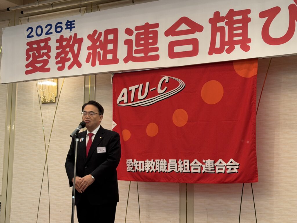 令和8年1月5日 同期の谷口県議が愛政連議員を務める愛知教職員組合連合会の旗びらきに出席しました。清水次郎会長や愛政連議員の斎藤嘉隆参議院議員から教育や教師の皆さんの現状のご挨拶があり、駆け付けた大村秀章愛知県知事から国に先んじて少人数学級の中学2年生までの拡大の件では大きな拍手が起こりました。