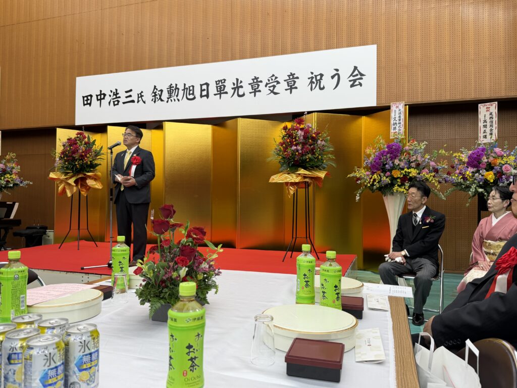 令和8年2月17日 長年に亘り祖父江町商工会会長や愛知県商工会連合会副会長などを歴任され旭日単光章の叙勲の栄に浴された田中浩三氏の祝賀会が挙行されました。大変多くの方々がお祝いに駆けつける中、知事ほかご来賓のご挨拶ののち鈴木も乾杯の発声をさせて頂き、お世話になっている田中様とご家族の皆さまにお祝い申し上げました。