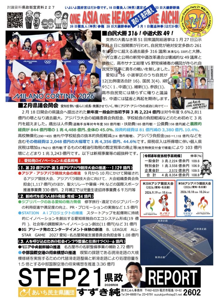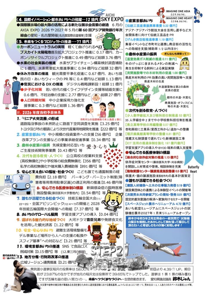 令和8年2月19日 STEP 21の2月の街宣活動を2月定例県議会開会日の18日と19日に木全市議はじボランティアの皆さんと行いました。主な内容は愛知県の新年度予算で先の衆院選にも触れました。今日から新年度予算など提出議案の説明会が実施されます。