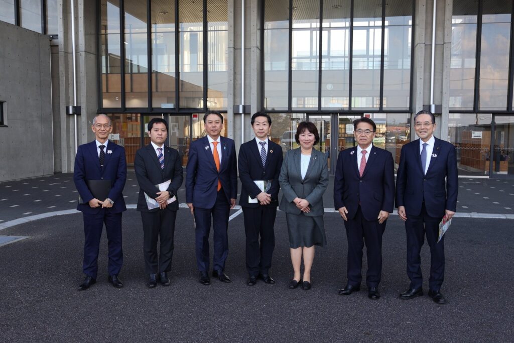 令和8年3月23日 埋蔵文化財調査のため半年ほど遅れましたがこの4月に共用開始の準備が整い大村知事が来校され関係議員として見学会に出席しました。2014年に開校した当時は267人48学級でしたが現在は347人60学級と子ども達が予想以上に増加したため今回校舎を増築しました。新校舎は既存校舎と渡り廊下で繋がっており20教室と職員室等で高等部が入ります。