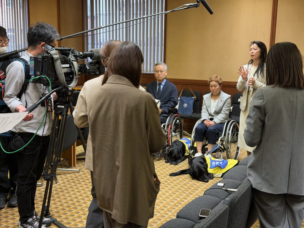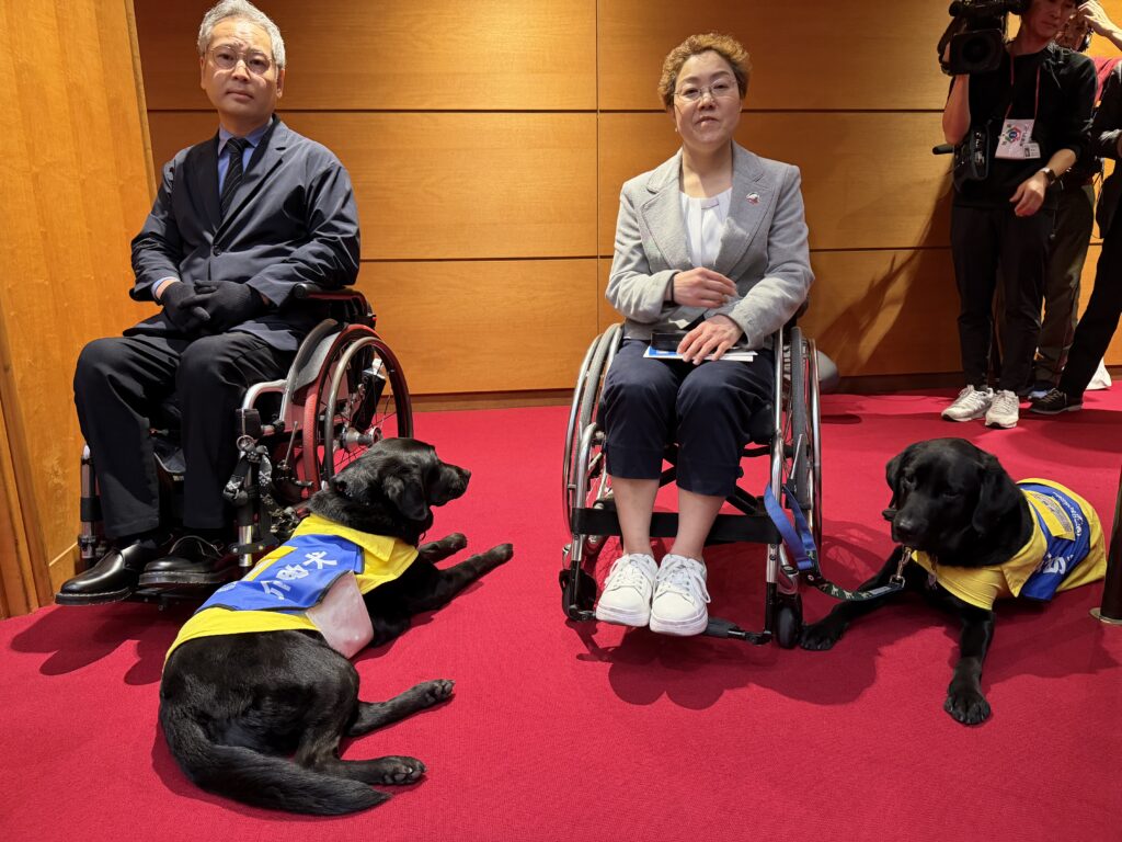 令和8年3月25日 2月議会閉会日に介助犬グラディスと介助犬候補犬のピトが議会傍聴席に来てくれました。ご主人の車椅子の横で、ピトは最初の進行係の「議長〜!」の大きな声に顔を上げて周りを確認しましたが、おとなしく2時間弱の議会が閉会するまで立派に役目を果たしました。県議会では障がい者の方の補助犬を伴う傍聴は認めていましたが候補犬は初めてのことです。昨年、日本介助犬協会創設30周年記念式典でお会いした協会理事長の高柳友子先生からは介助犬自体を知らない方がまだまだ多く議会での取組は違った環境での訓練になりPRにもなるのでこれからも取組んでいきたいとインタビューに答えていらっしゃいました。県議会では傍聴席に入るには児童及び乳幼児は議長の許可が必要でしたが傍聴規則の一部改正をして許可不要とするなど皆様に傍聴しやすい開かれた議会への取組を進めています。