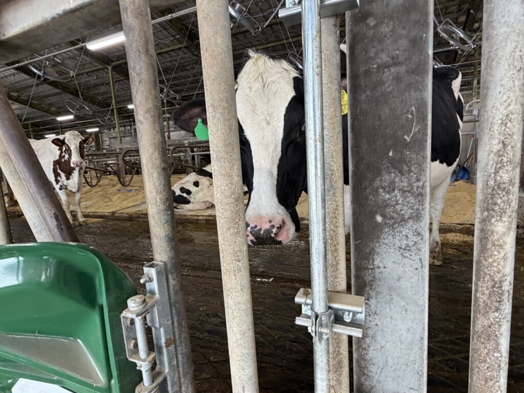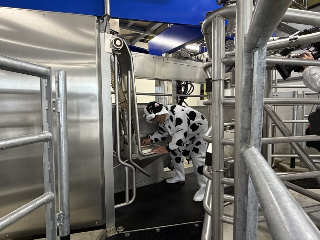 乳牛が搾乳しながら飼料を食べてするげっぷを計測(知事が乳牛の代わりにメディア向けパフォーマンス)