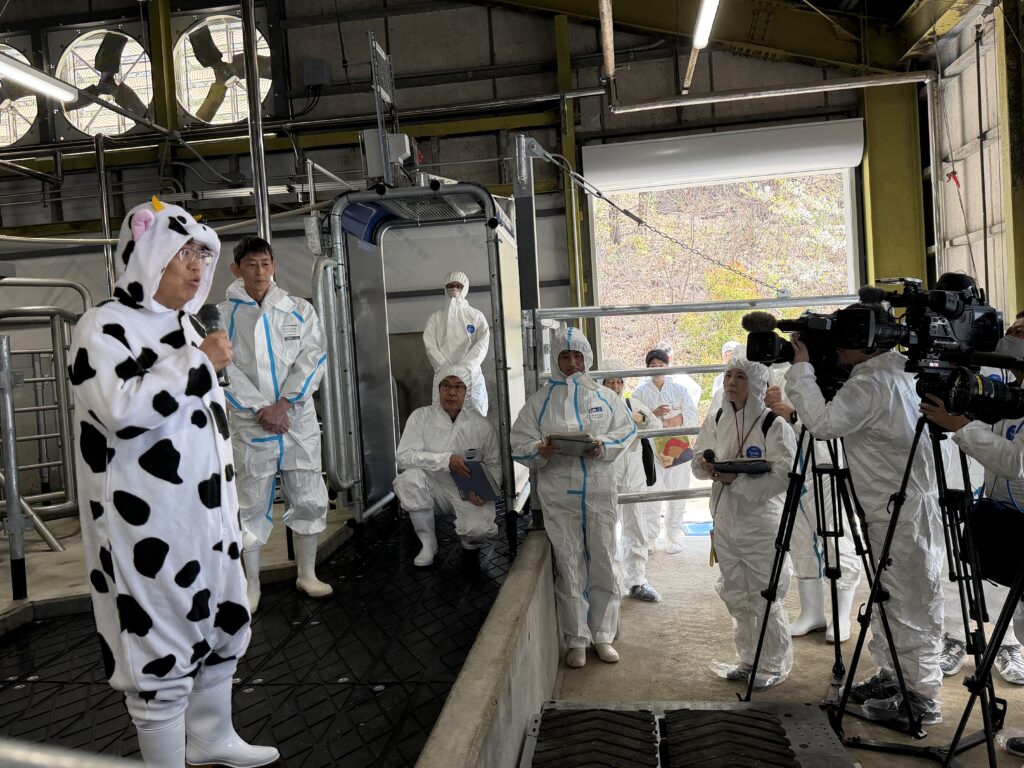 令和8年4月8日 牛のげっぷ由来のメタンガス(CH4)削減に向けた測定器等の設備完成に伴う報道機関向けの内覧会があり参加しました。経緯は古本副知事がオーストラリア視察時に牛のげっぷのCH4削減を図ったCN牛乳が販売されていたとの報告から大村知事が地球温暖化防止の観点から畜産も本県は中部地方で一番でありCH4の削減は重要と判断したためです。試験研究では牛のげっぷ由来のCH4を削減する飼料等を開発するため、農業総合試験場内の乳牛舎にメタンガス測定器等を整備し本格的に試験研究を開始します。知事は説明の中で飼料等の開発には愛知の特産品の稲沢・祖父江のギンナンの処分される果肉部分が利用されることに期待している旨を発言頂きました。(※CH4は二酸化炭素の約28倍の温室効果があり、牛が胃の中で牧草や穀物を微生物に発酵させて消化する過程でCH4が副産物として発生し、げっぷとして大気中に放出(体重600キロの成牛の場合、1頭で1日に300から600ℓ CH4全排出量の約27%)されます。)