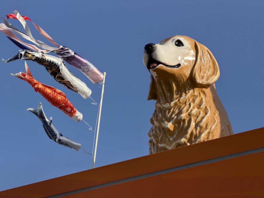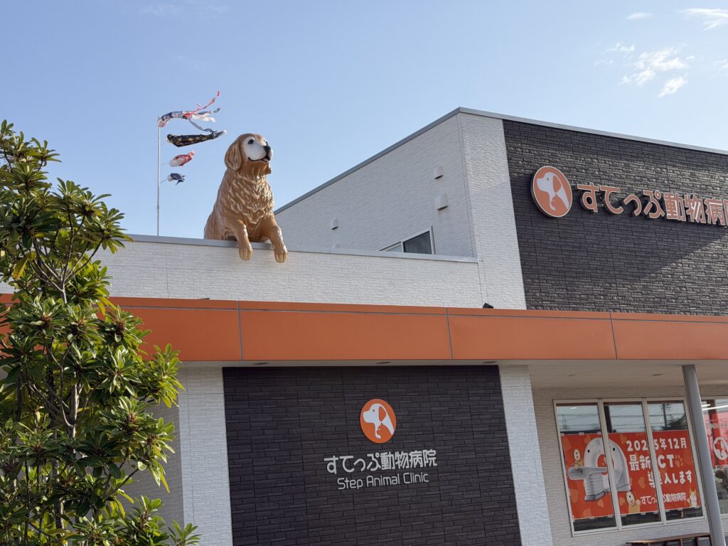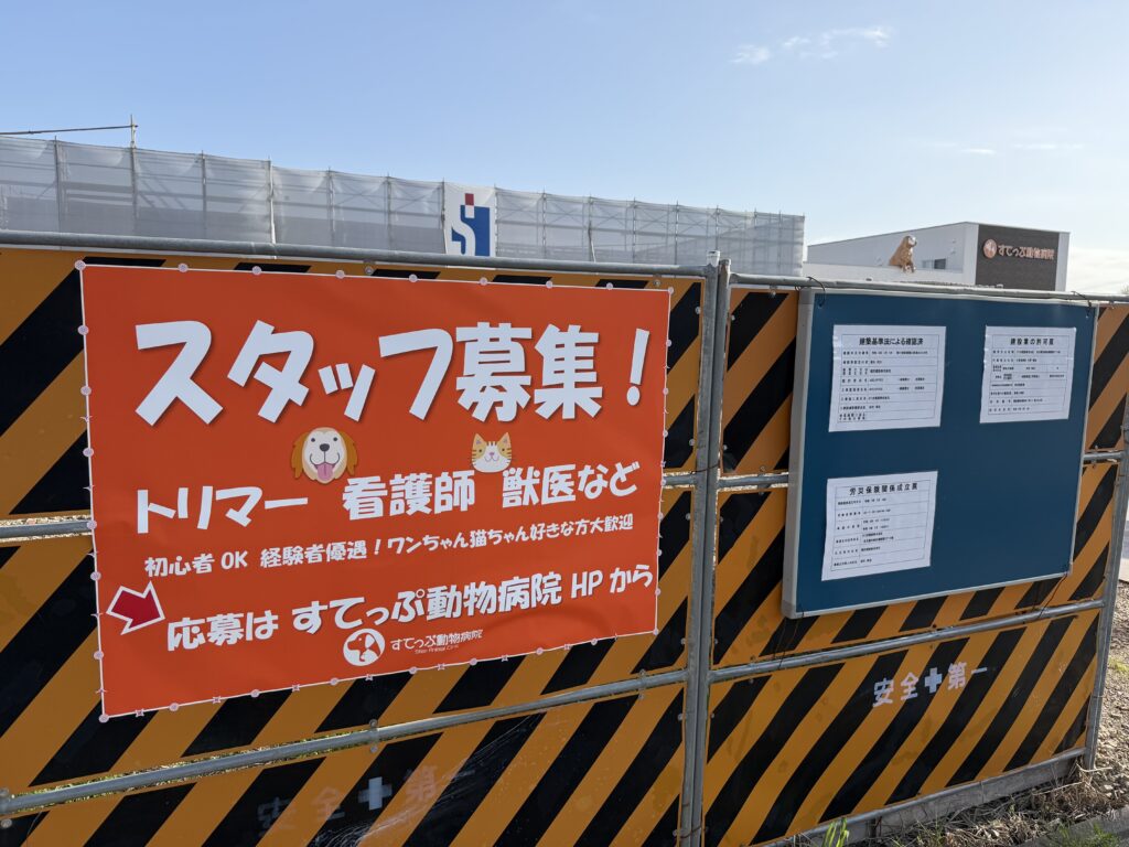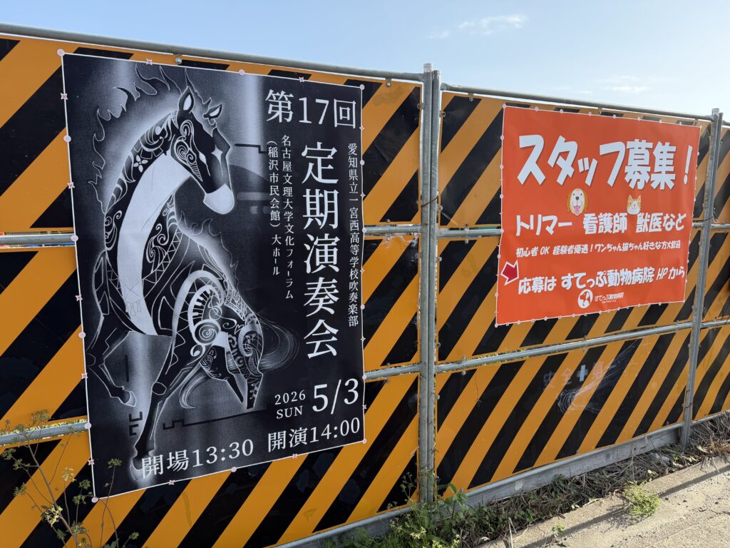令和8年4月20日 すてっぷ動物病院のすてっぷくんのところに今年もこいのぼりを設置しました。また、隣で建設中のすてっぷ動物サロンの工事用の囲いにスタッフ募集と一宮西高の吹奏楽の大きくしたポスターを提示しました。