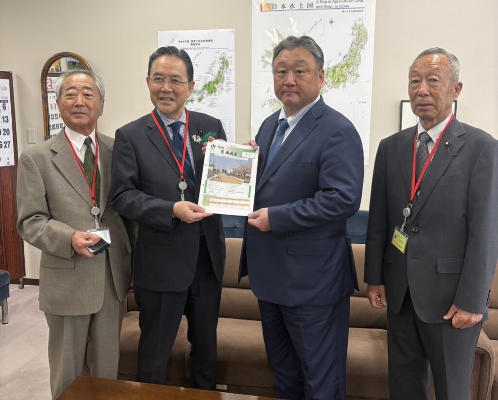 令和8年4月27日 会長を務める濃尾用水協議会(宮田用水土地改良区理事長)で関係する木津用水(長谷川理事長)、羽島用水(高橋理事長)の皆さんで農林水産省、進藤参議院議員、藤川参議院議員はじめ関係の皆様に新年度の挨拶(穂積理事長から代わられた長谷川理事長のご紹介)に伺い、新濃尾2期のお礼と濃尾3期のお願いをしました。