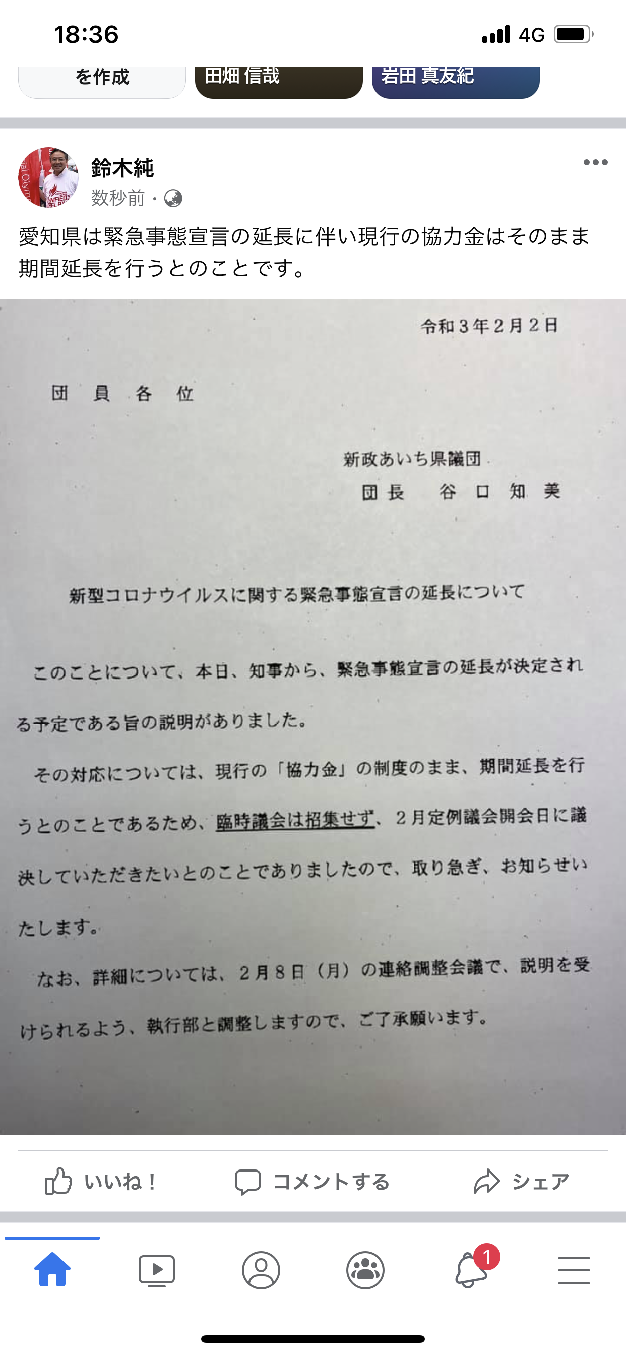 令和3年1月14日 緊急事態宣言が再発出された中、1月2回目の臨時県議会が招集され時短協力金(既報のように愛知県全域、飲食店対象、午後8時までの営業、1日当たり6万円)の補正予算を可決しました。毎月の街宣で報告するところですが宣言中のため事前に作成した資料をHPで公開するのみと致しましたので宜しくお願いします。