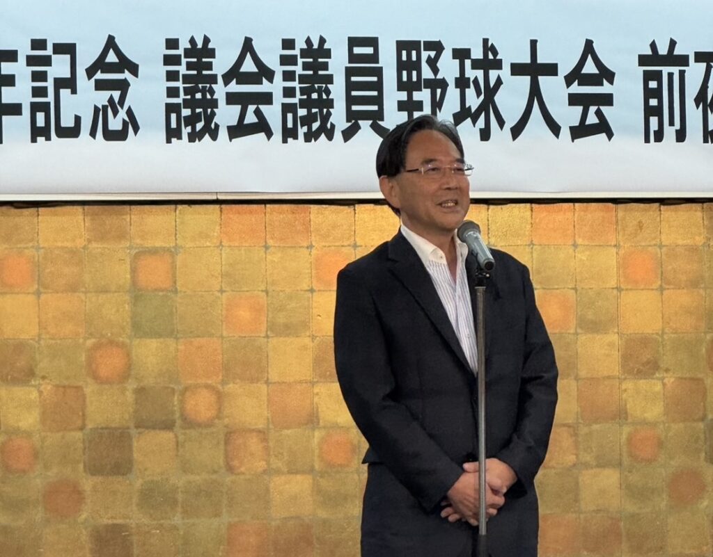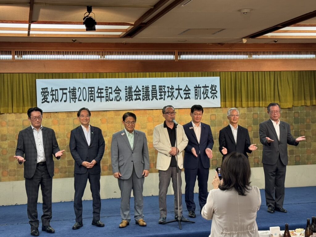 令和7年9月3日 愛知万博20周年記念議会議員野球大会が近藤監督や寺西主将などのお骨折りにより開催され前夜祭には群馬、千葉、石川、奈良、愛媛、福岡(京都は5日来県で愛知との試合予定でしたが台風のため中止に)の皆さんに参加頂きました。