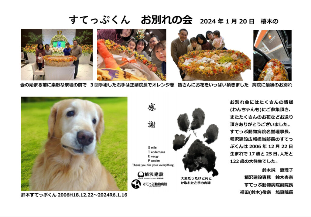 令和6年1月19日 長年家族の一員として鈴木家の元気の源であったゴールデンレトリバーの鈴木すてっぷ君が1月16日に17歳25日で虹の橋🌈に向かいました。明日午後2時から下記のようにささやかなお別れの会を行いますのでHPをお借りしてご案内させて頂きます。