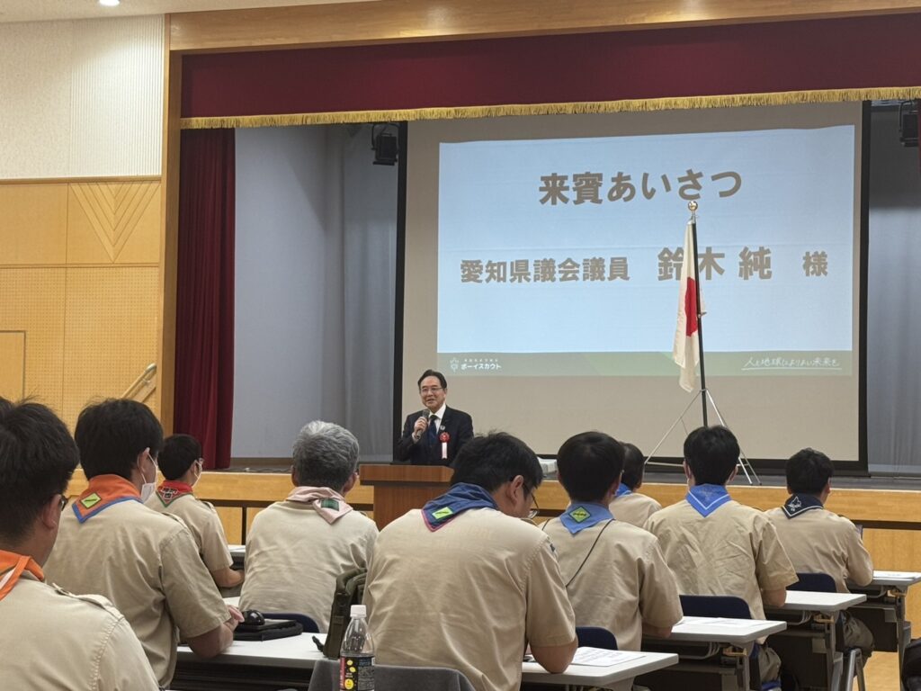 令和8年4月12日 日本ボーイスカウト愛知連盟尾張西地区第17回年次総会が開催されボーイスカウト振興愛知県議会議員懇談会所属議員として一宮選出の平松議員と出席しました。地元議員を代表して鈴木から菊章受賞のスカウトをお祝いし、アジア・アジアパラでのスカウトの活躍の場や日本ジャンボリーなどに触れながら青少年の健全育成に取り組む指導者の皆様に敬意と感謝を表しました。