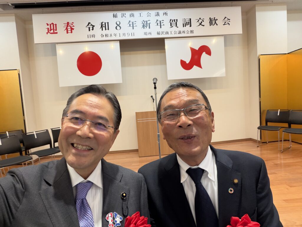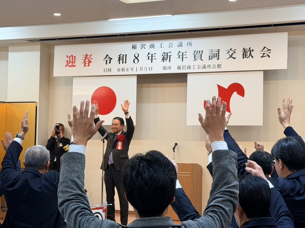 令和8年1月9日 稲沢商工会議所(池戸会頭)の令和8年新年賀詞交歓会が多くの会員の皆さんがご参集して盛大に開催されました。鈴木純は中締めで2026年は21世紀の第二四半世紀のスタートで25年後は2050年の節目となることに触れて未来に向けて万歳三唱の発声を務めました。また、午後にはあいち民主県議団重点等調査研究会に出席後、平和町商工会(水谷光宏会長)の賀詞交歓会にも遅れて出席しました。